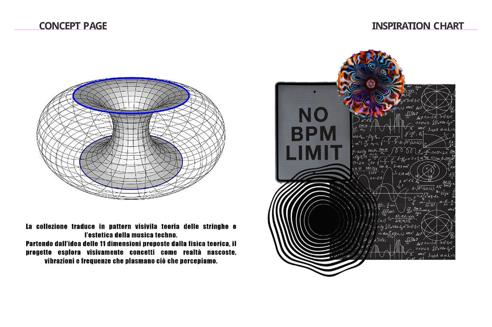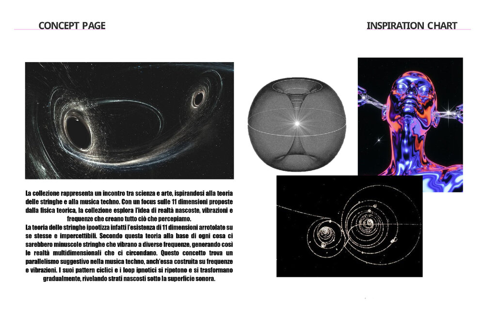 Il primo progetto è una collezione donna ready to wear che fonde lo stile streetwear con accenti più drammatici, grazie all’uso del pizzo e di dettagli sartoriali come fibbie, stringhe e zip, ispirata alla teoria delle stringhe e alle vibrazioni della musica techno.
