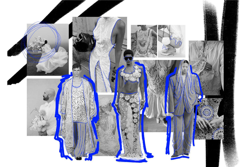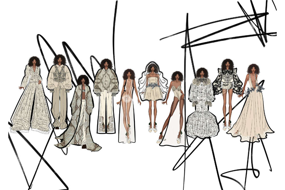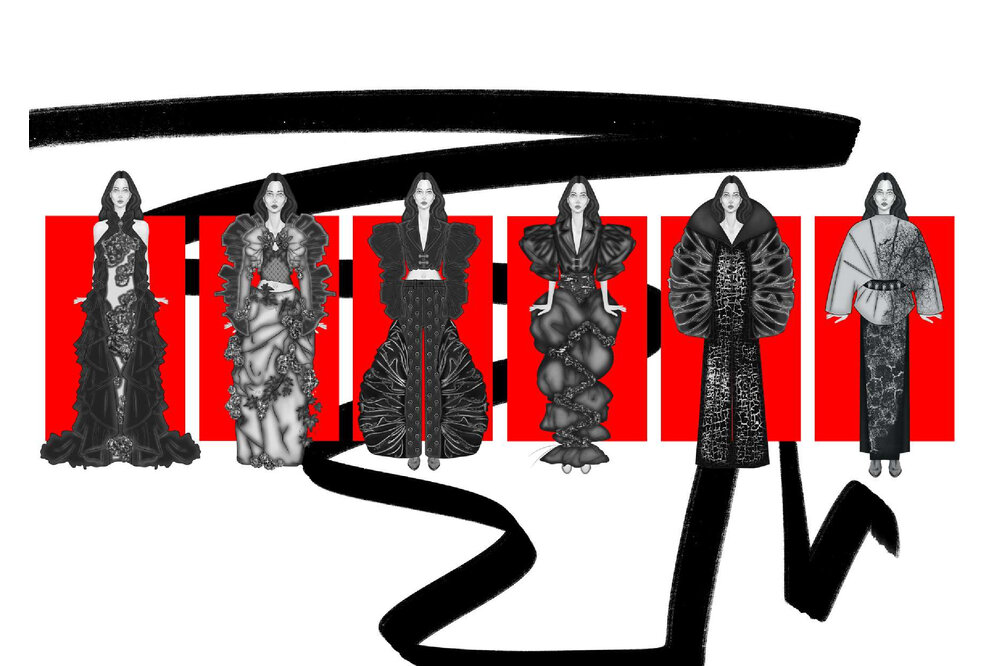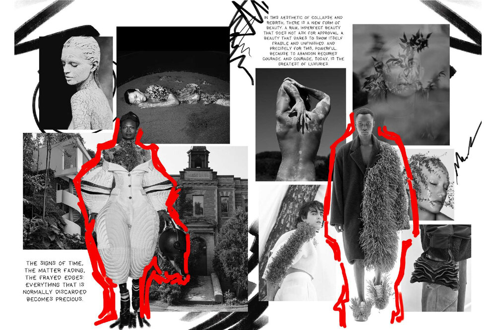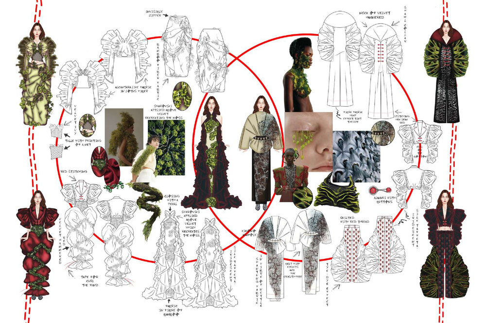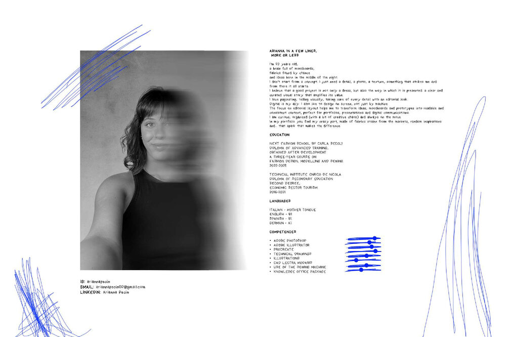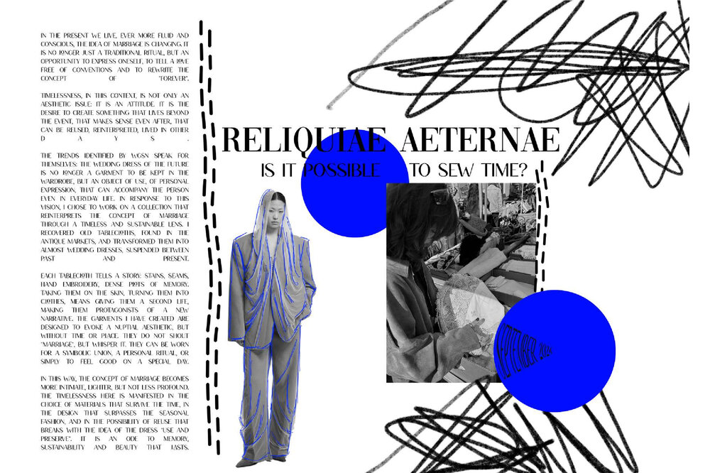 Innesco è il mio punto di partenza. Non costruisco prima un concept, ma lascio che sia un dettaglio a far scattare la mia creatività. Una foto, un tessuto, una forma, è lì che tutto comincia. È in quel momento che mi innesco. Questo scatto, quest’immagine, spesso arrivano dal mondo dell’editoria e del digitale, due ambiti che mi appassionano e in cui trovo continuamente stimoli. Le foto non sono solo ispirazione visiva, ma vere e proprie scintille per la mia creatività, capaci di far scattare nuove idee e combinazioni. Il mio processo creativo è istintivo e visivo: lascio che sia l’intuizione a guidarmi. Un colore, una trama, una sensazione tattile diventano scintille da cui nasce una visione. E così è nato anche questo portfolio, che non racconta solo una collezione, ma un modo personale di osservare il mondo. In “Innesco” i protagonisti sono i dettagli, ma anche i colori, scelti non per seguire una tendenza, ma per evocare emozioni e significati. Ogni tavola, figurino, scelta tessile e cromatica è frutto di questo approccio spontaneo ma coerente. Innesco è il mio modo di lavorare, ma anche di essere. È il mio primo passo e il mio primo impulso.