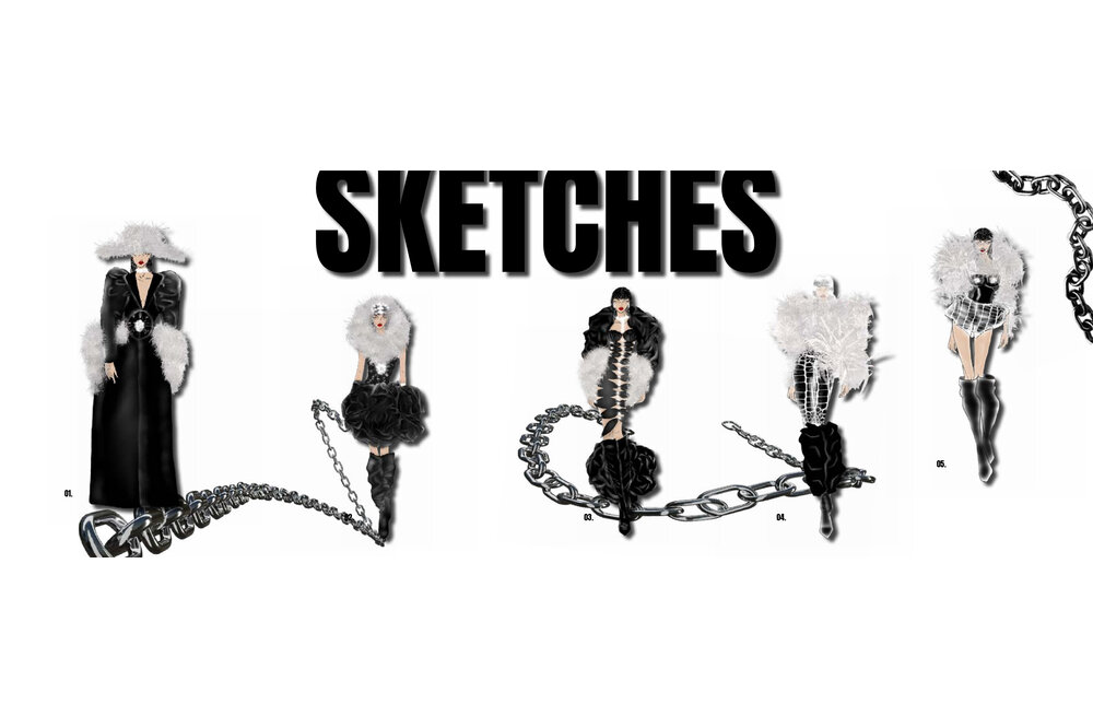 Da questa visione nasce una collezione che è dichiarazione pura: volumi scultorei, silhouette esagerate, superfici luminose che catturano lo sguardo. A dominare, il nero, non come assenza, ma come presenza potente.