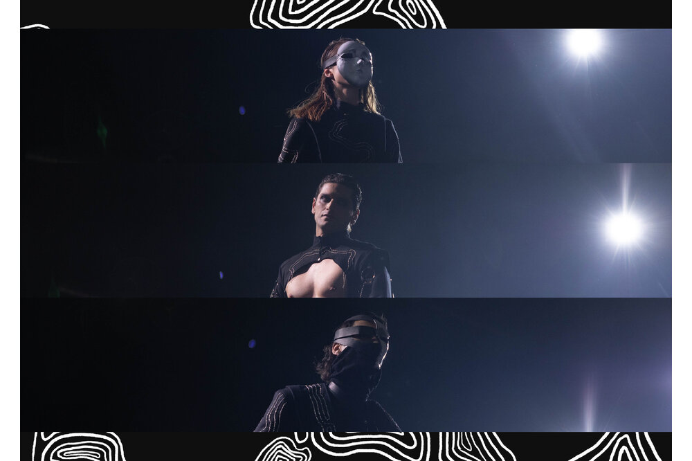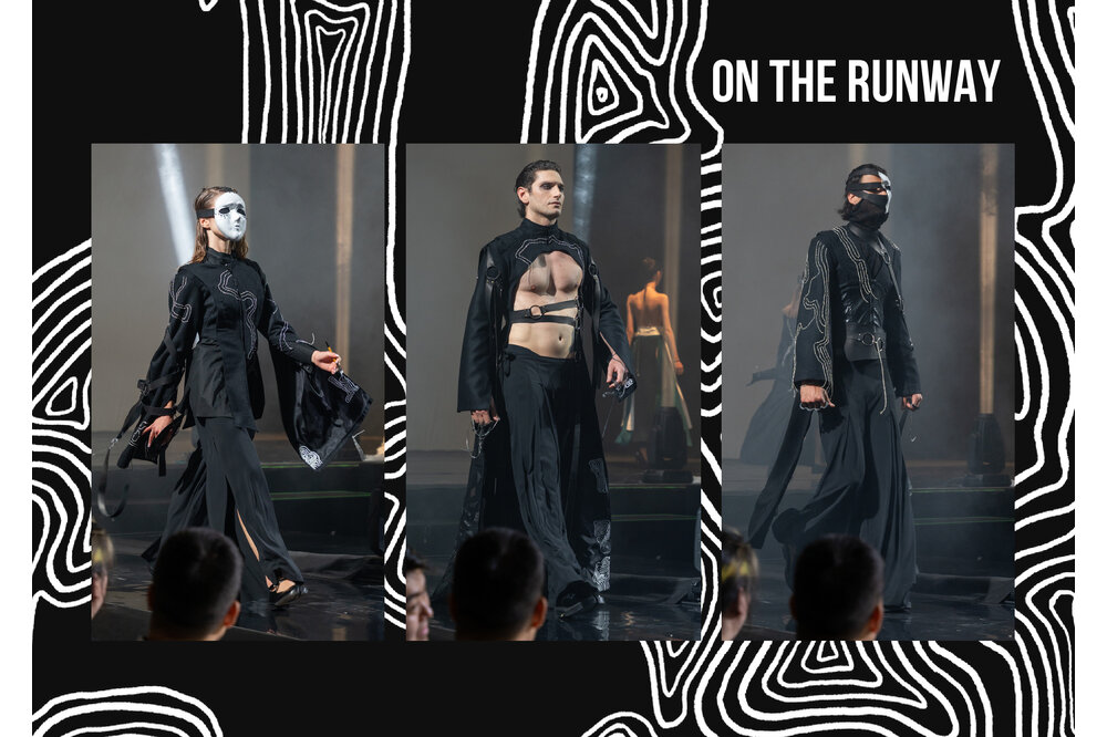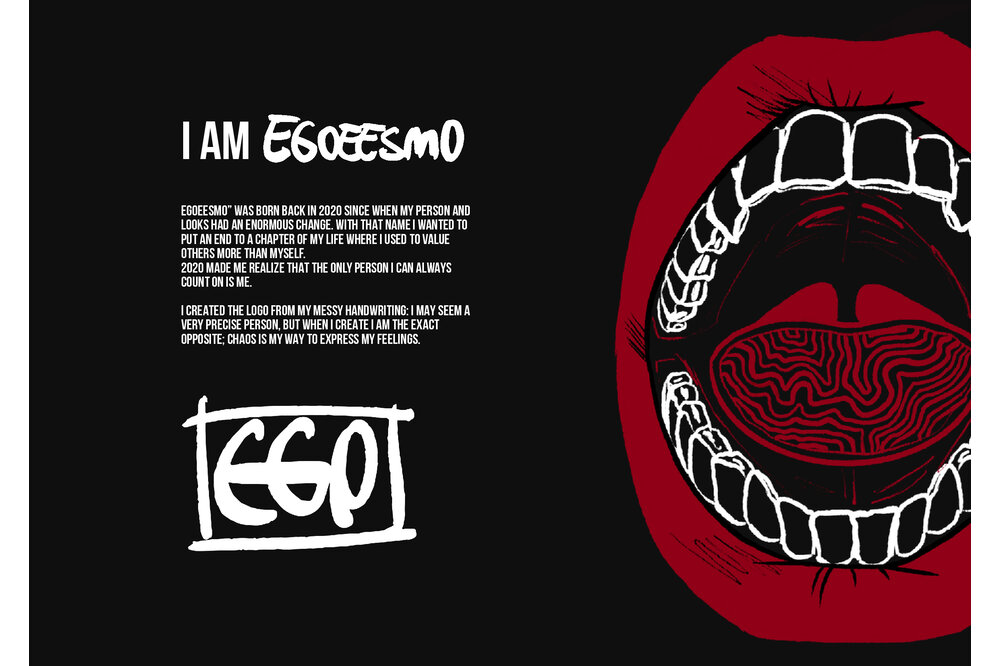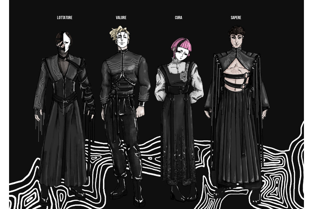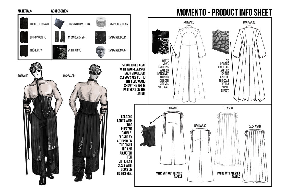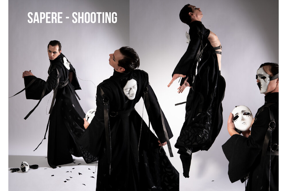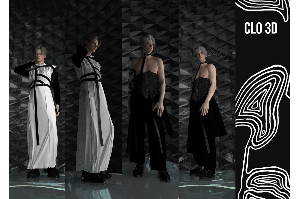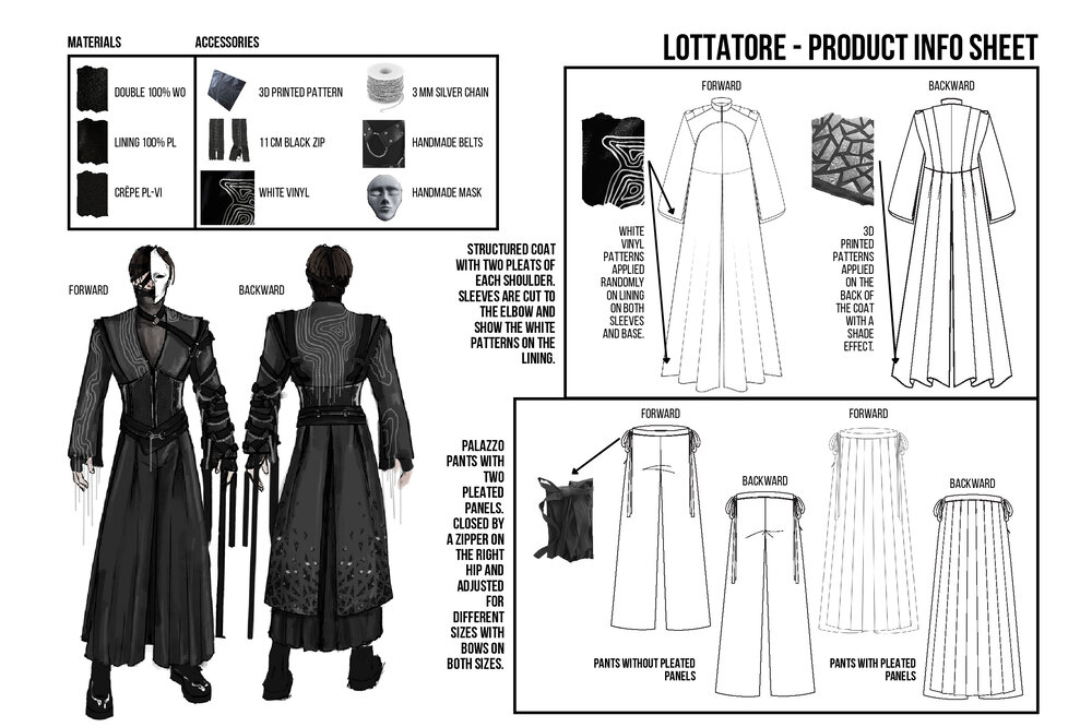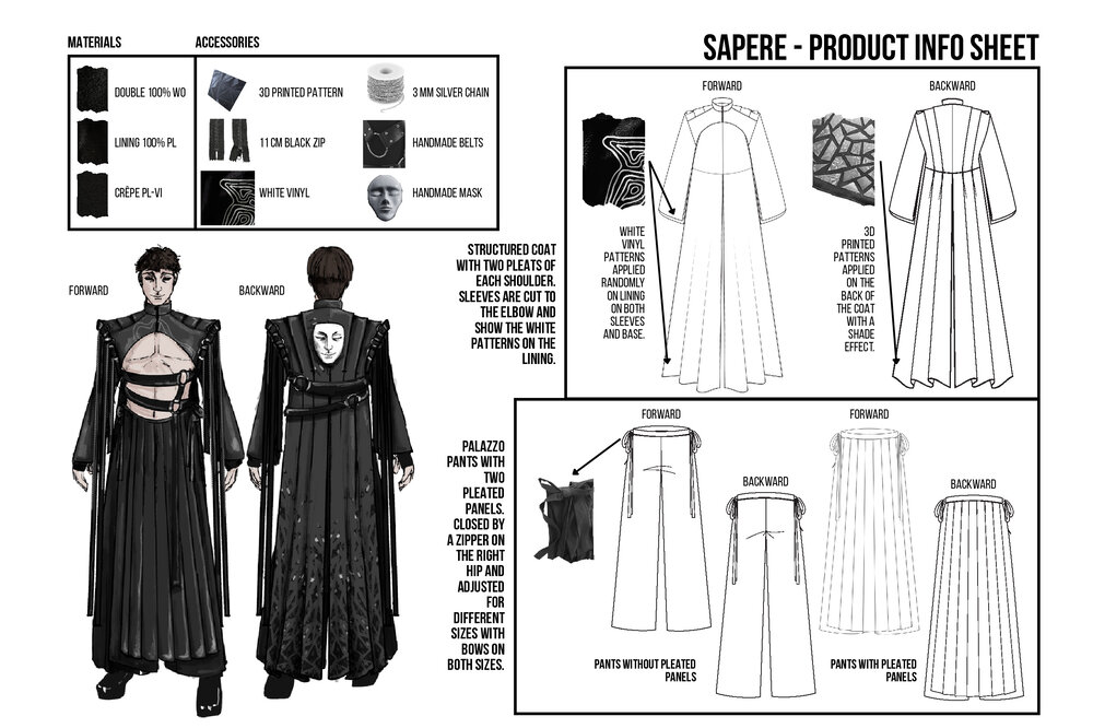 My Amico Fragile is an inner journey that leads to the perfection of the individual, by improving yourself exposing your fragilities and fixing them: my fragility is Anger. The collection reflects anger as a black and white color palette representing my ups and downs, using strong and heavy fabrics such as leather and wool cloth. The chains embroidered on the garments are meant to give a cold look, following random patterns I always use to draw whenever I feel anxious or stressed. The constrictions of the self imposed isolation is represented by multiple belts and harnesses all over the body.