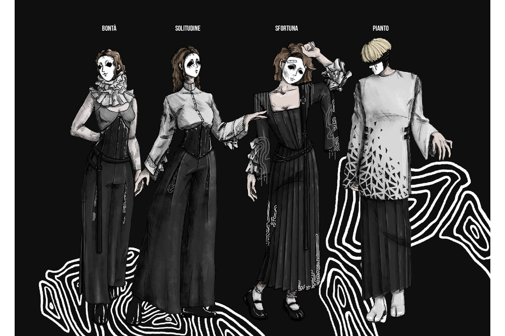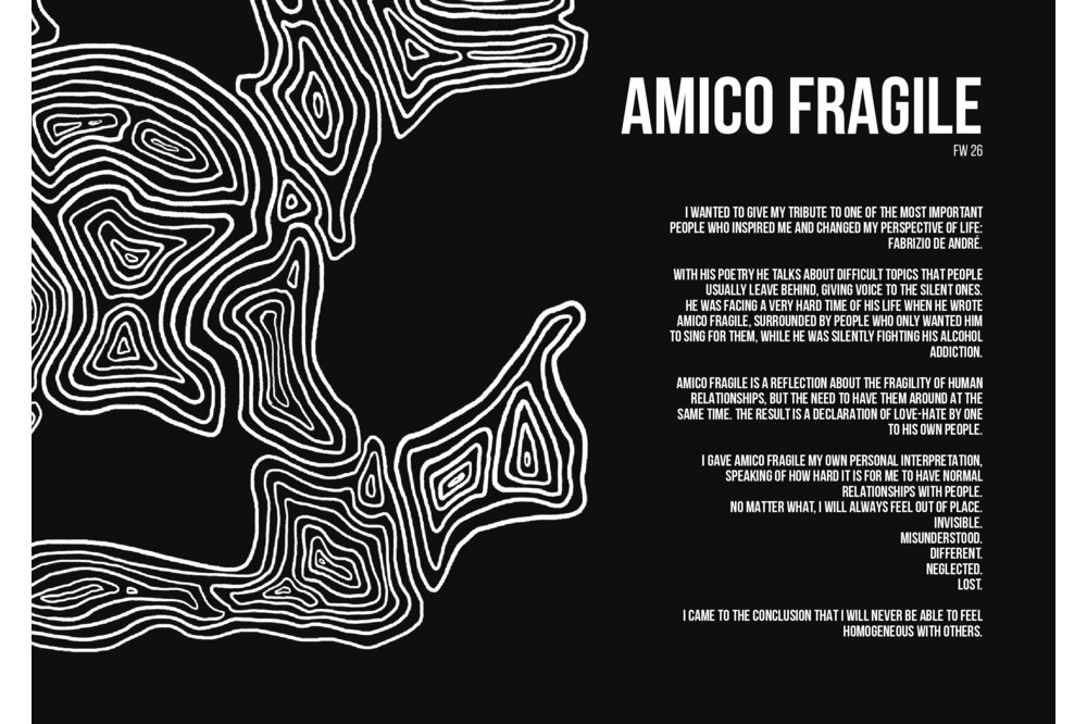 Con la mia collezione volevo rendere omaggio a una delle persone più importanti che mi ha ispirato e ha cambiato la mia prospettiva di vita: Fabrizio De André. Amico Fragile è una riflessione sulla fragilità delle relazioni umane, ma anche sulla necessità di averle accanto. Il risultato è una dichiarazione di amore-odio di un individuo verso la propria gente.