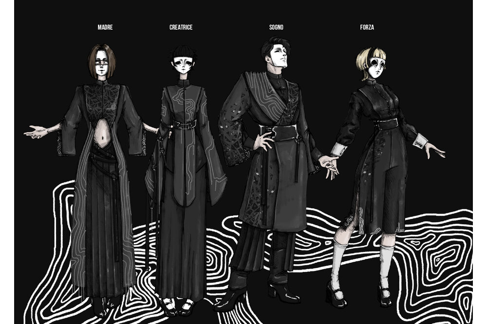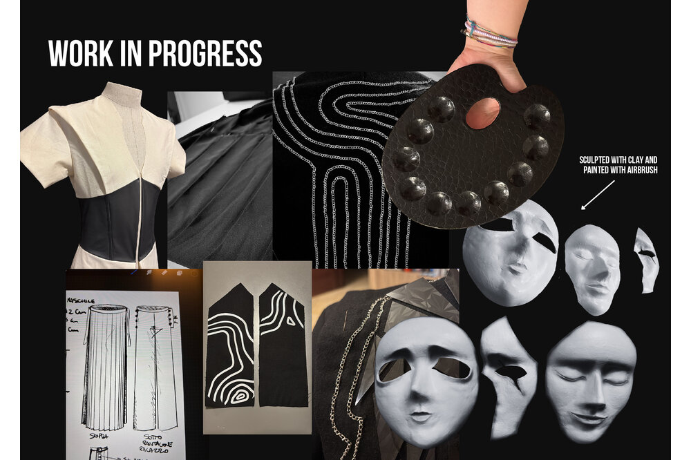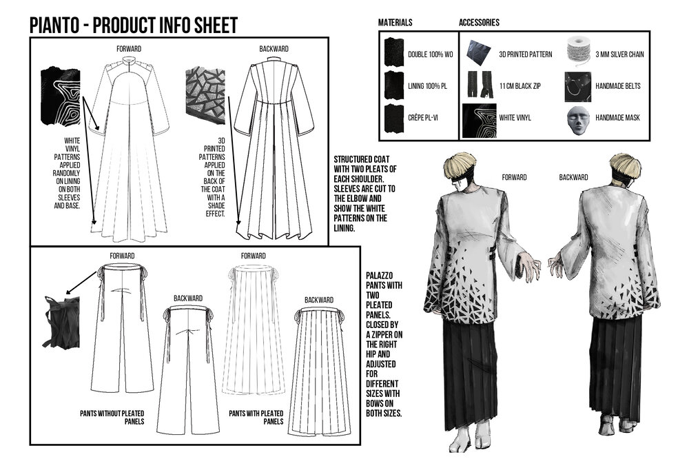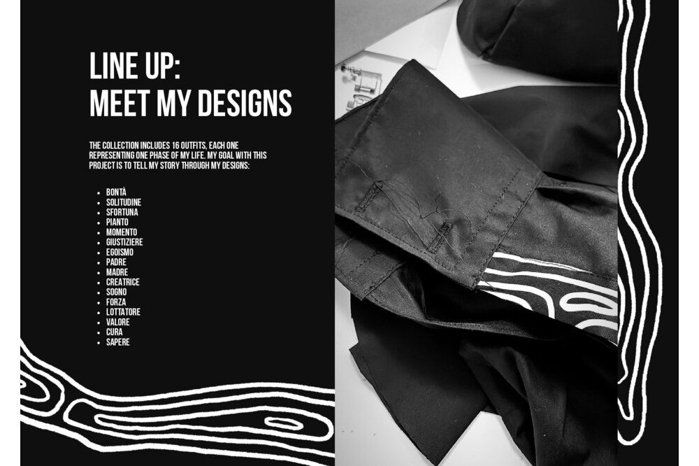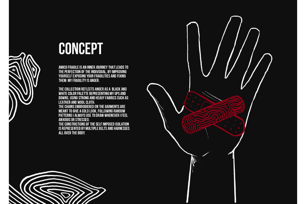 Il mio Amico Fragile è un viaggio interiore che conduce alla perfezione dell’individuo, migliorando se stessi, esponendo le proprie fragilità e correggendole: la mia fragilità è la Rabbia. La collezione riflette la rabbia attraverso una palette di colori in bianco e nero che rappresenta i miei alti e bassi, utilizzando tessuti resistenti e pesanti come la pelle e la lana. Le catene ricamate sui capi intendono conferire un aspetto freddo, seguendo i motivi casuali che disegno sempre quando mi sento ansiosa o stressata. Le costrizioni dell’isolamento autoimposto sono rappresentate da molteplici cinture e harness su tutto il corpo.