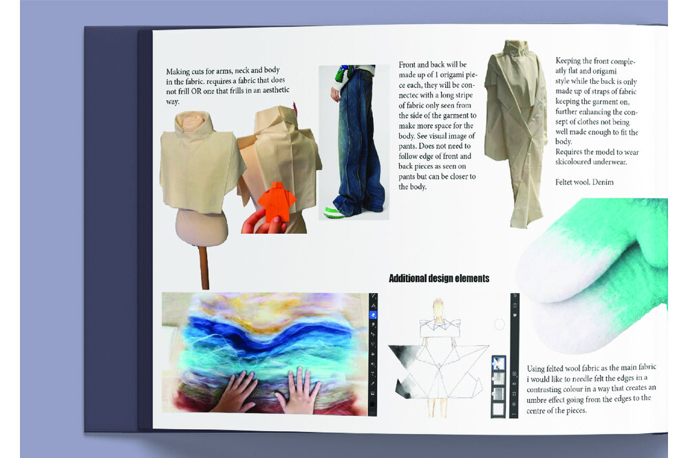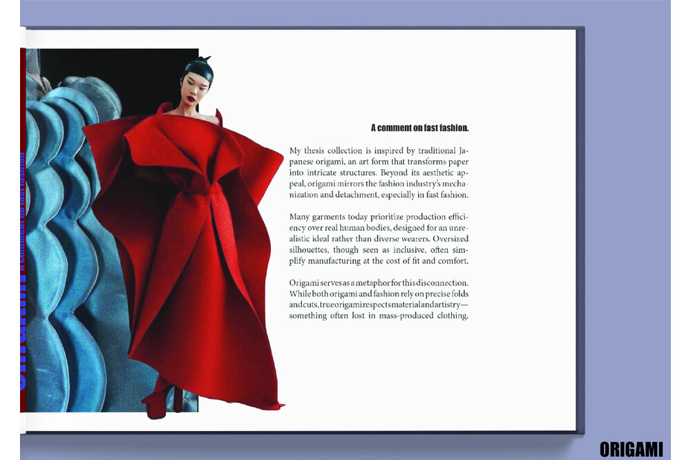 La mia collezione finale trae ispirazione dall’origami giapponese, utilizzandone la precisione e l’artisticità come critica al distacco e alla produzione di massa del fast fashion. Mentre l’origami rispetta il materiale e la struttura, il fast fashion spesso sacrifica vestibilità, comfort e integrità per l’efficienza. Con questa collezione voglio reintrodurre cura, intenzione e artigianalità nell’abbigliamento contemporaneo.