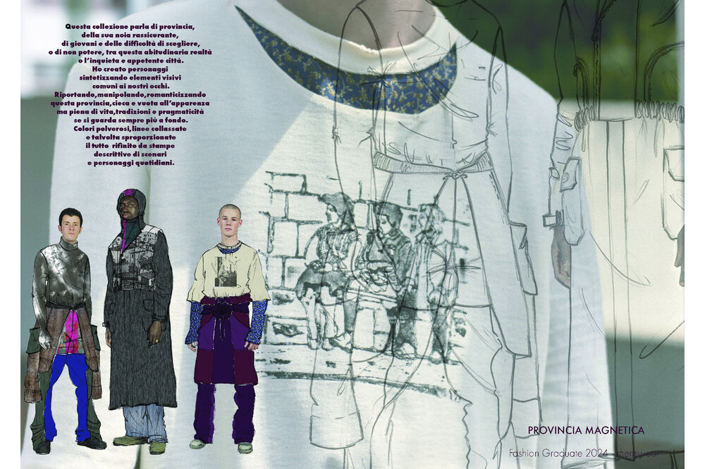 Questo portfolio contiene alcuni dei progetti che in questi anni di studi e lavori ho potuto realizzare. Un tentativo di spiegare e mostrare la mia visione creativa ed il mio modo di tradurre idee in forme, colori, concetti, tessuti, personaggi. La mia indole creativa è estremamente materica, le persone ed i loro mondi, vissuti, tradizioni e pensieri sono la mia principale e più ricca fonte di ispirazione per tutto il quadro del progetto. Di fondamentale importanza per me è l’emozionalità che i capi devono trasmettere a chi li guarda e soprattutto a chi li indossa. La strutturalità, le forme, i tessuti scelti ed i colori sono necessari allo questo scopo. Ogni capo nasconde potenziali significati ed emozioni che devono essere in grado di lasciare qualcosa; altrimenti il senso non c’è.