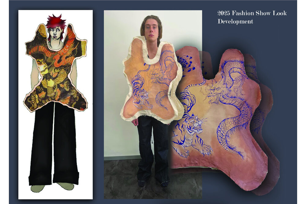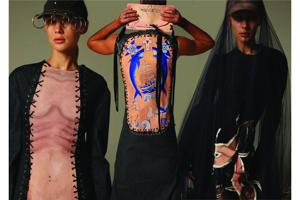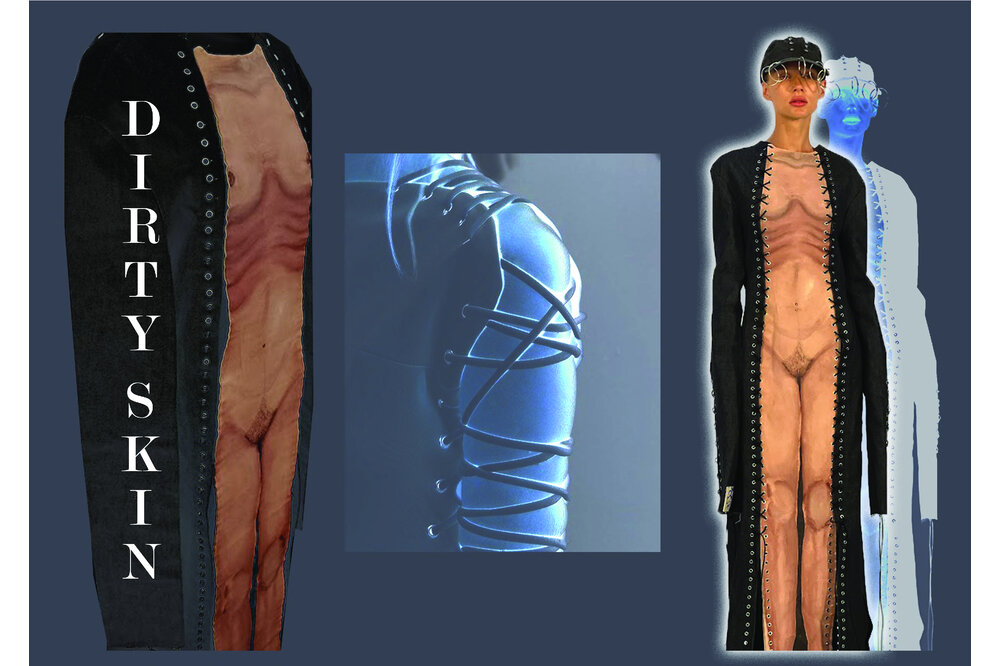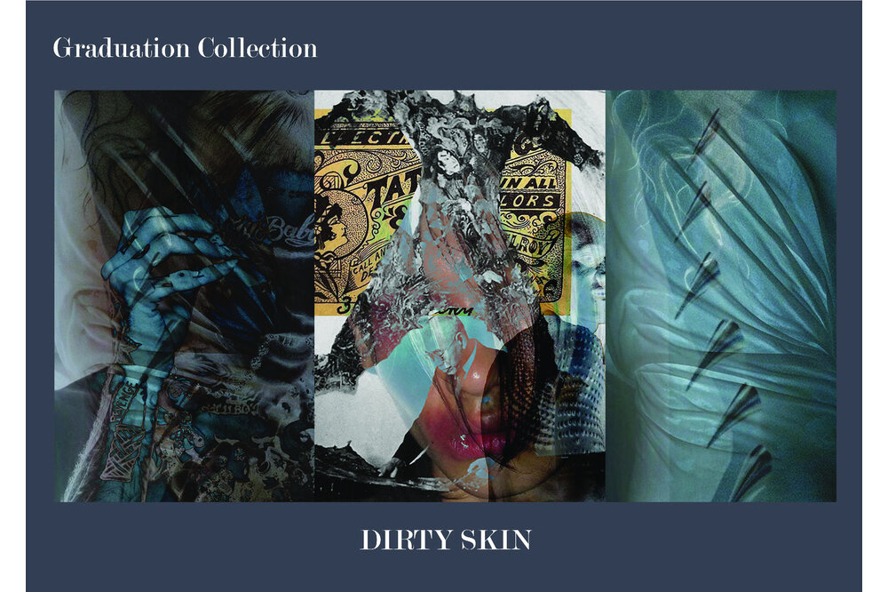 La collezione “Dirty Skin” connette l’arte del tatuaggio al mondo della moda attraverso un percorso tra culture differenti accomunate dal rito del tatuaggio. Con l’utilizzo di inserti dipinti con colori acrilici, i diversi capi prendono il vero e proprio ruolo di “seconda pelle”.
