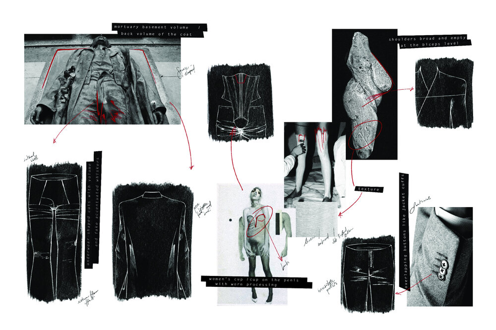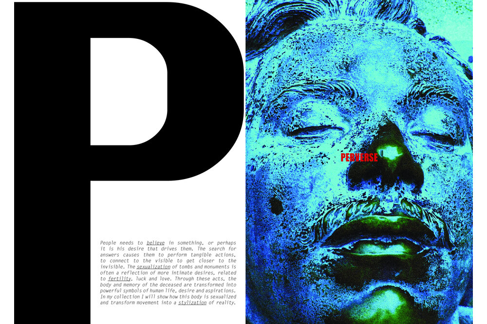 People needs to believe in something, or perhaps it is his desire that drives them. The search for answers causes them to perform tangible actions, to connect to the visible to get closer to the invisible. The sexualization of tombs and monuments is often a reflection of more intimate desires, related to fertility, luck and love. Through these acts, the body and memory of the deceased are transformed into powerful symbols of human life, desire and aspirations. In my collection I will show how this body is sexualized and transform movement into a stylization of reality.