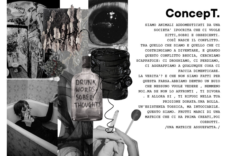 Siamo animali addomesticati da una società ipocrita che ci vuole zitti, sobri e obbedienti.Così nasce il conflitto.Tra quello che siamo e quello che ci costringiamo a diventare, e quando questo conflitto brucia, cerchiamo scappatoie: ci droghiamo, ci perdiamo, ci aggrappiamo a qualunque cosa ci faccia dimenticare.La verità? È che non siamo fatti per questa farsa. Abbiamo dentro un buio che nessuno vuole vedere, nemmeno noi. Ma se non lo affronti, ti divora. E allora sì, ti rifugi nella tua prigione dorata. Una bolla. Un’esistenza tossica, ma intoccabile.Questo siamo. Frutti marci di una matrice che ci ha prima creati, poi corrotti./Una matrice assuefatta./