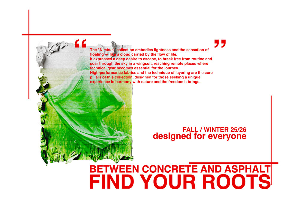 La collezione “NIMBUS” rappresenta un’esperienza adrenalinica, un desiderio di evadere dai confini e di sentirsi liberi e leggeri. Il motto che la guida è: “In mezzo all’asfalto e al cemento, trova le tue radici”.