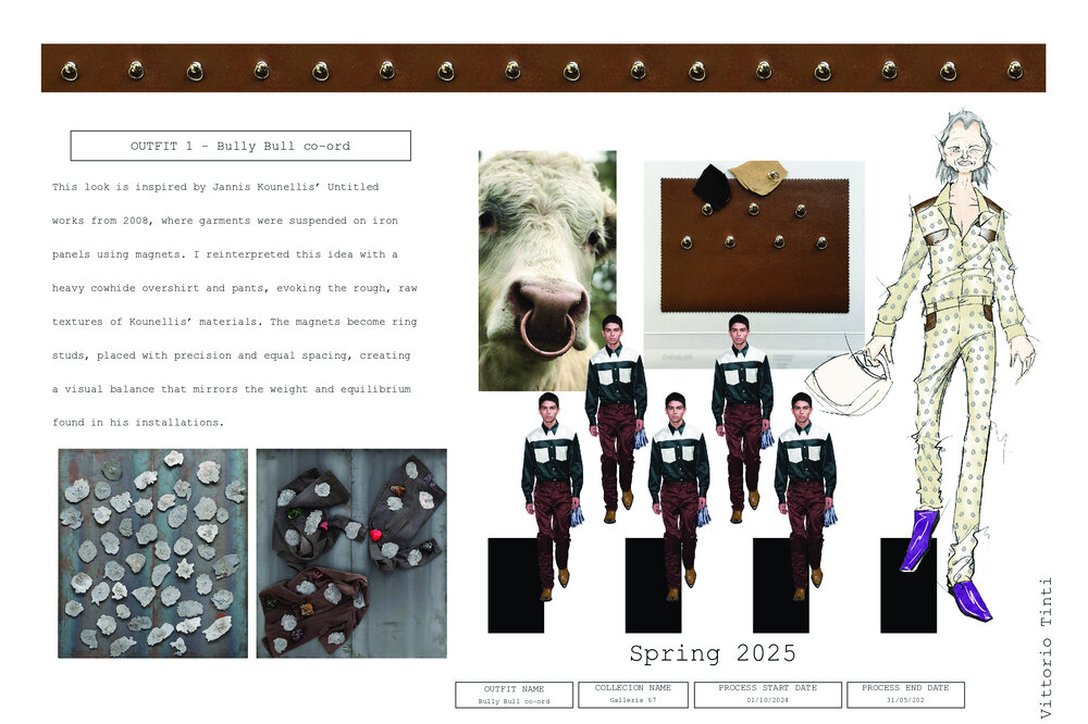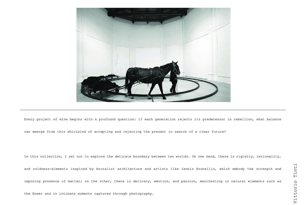 Galleria 67 originated from the 1967 exhibition at Galleria La Bertesca in Genoa, which was a foundational moment for Arte Povera. Just as the finished works challenged conventions to highlight matter and concept, my collection also seeks to break away from tradition, creating new forms of expression. I navigate the tension between rigour and fragility, brutalism and nature, striving to establish a delicate balance between strength and poetry. Elements such as Kounellis, concrete, flowers, and skin all blend together in an ongoing dialogue between rejection and memory. It is an open dialogue between past and present, aiming to uncover a deeper, more intimate, and vibrant truth.